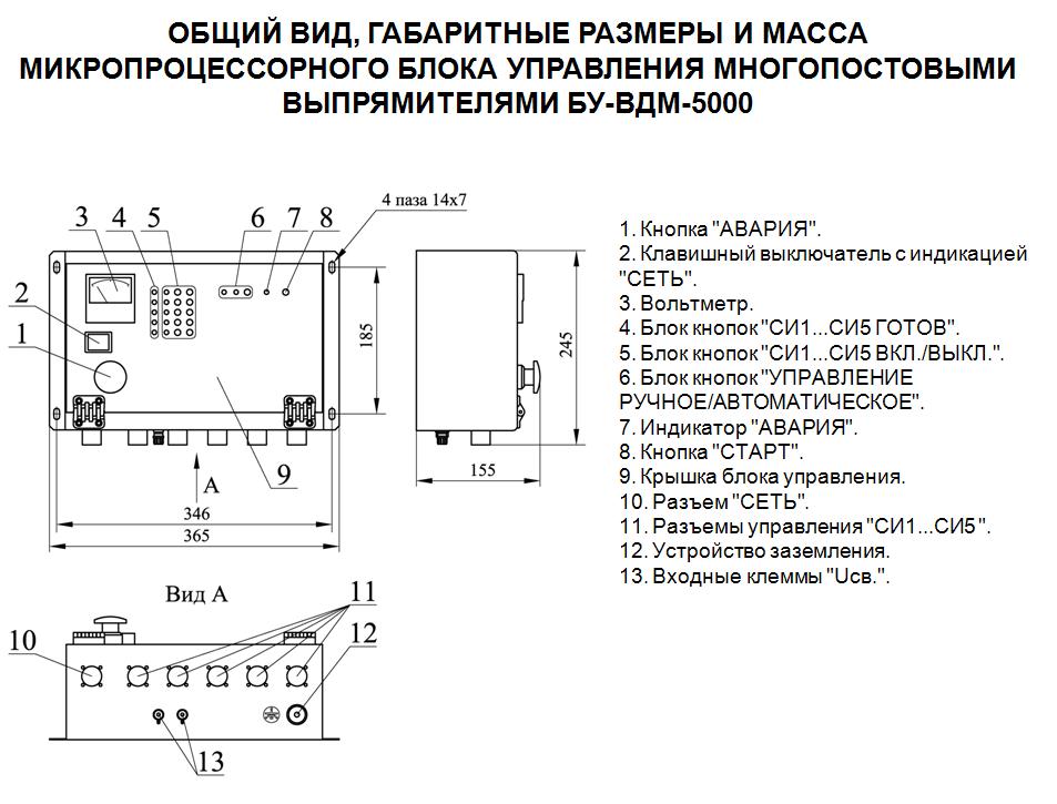 Блок управления многопостовыми выпрямителями состоит из корпуса, в котором расположен трансформатор, плата управления, вольтметр, сетевой выключатель, кнопка аварийного отключения.