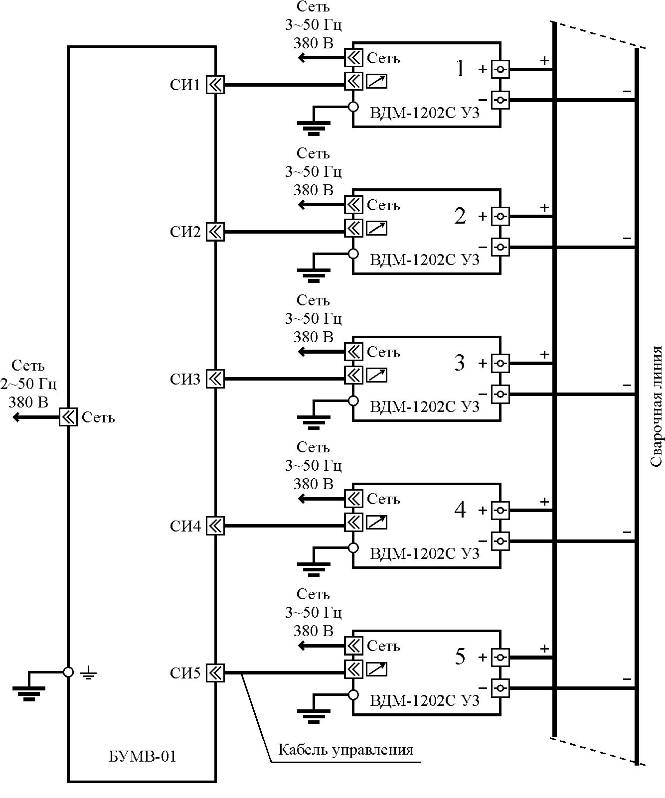 ВДМ-5000 предназначен для централизованного питания постов при многопостовой дуговой сварке в углекислом газе плавящимся электродом (малоуглеродистой проволокой), а также может быть использован в качестве источника питания при сварке под флюсом и наплавке. Многопостовой сварочный выпрямитель ВДМ-5000 состоит из пяти сварочных выпрямителей ВДМ-1202С У3, серия 06 исполнение 10, производства АО ЭМЗ "ФИРМА СЭЛМА" и блока управления многопостовыми выпрямителями для дуговой сварки БУМВ-01. Также использование блока управления БУМВ-01 возможно с другими выпрямителями при обязательном согласовании с заводом-изготовителем блока. Блок в автоматическом режиме (без участия оператора) позволяет оптимизировать количество выпрямителей, одновременно подключенных к сварочной цепи. В процессе работы блок обеспечивает ручное/автоматическое управление, включение/выключение до пяти выпрямителей с индикацией состояния, индикацию напряжения на сварочной линии, аварийное отключение всех источников независимо от состояния блока.