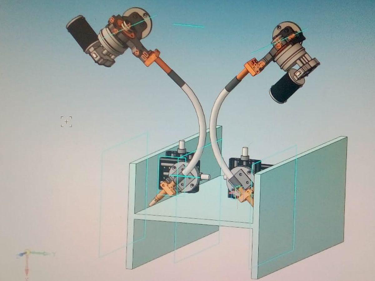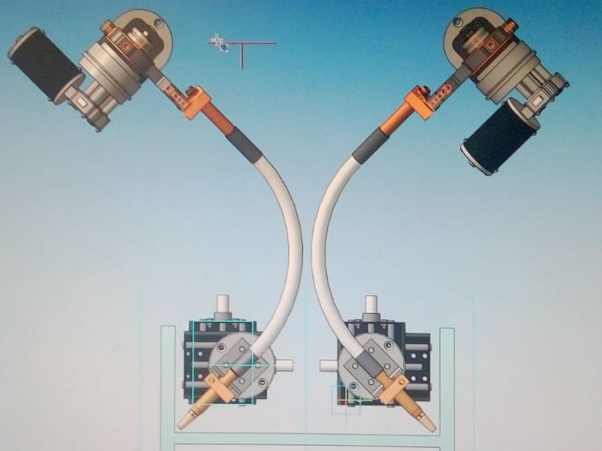 - кронштейны крепления двух сварочных головок АДФ-1000, - кронштейны для установки двух флюс-бункеров (объемом 10 л) и системы рециркуляции флюса СОФ, - кронштейны для устройства размотки проволоки; - узел токоподвода «+» для каждой головки с возможностью наклона и регулирования перемещения токоведущих наконечников по вертикали и горизонтали; - пневматическую систему фиксации токоподводов.